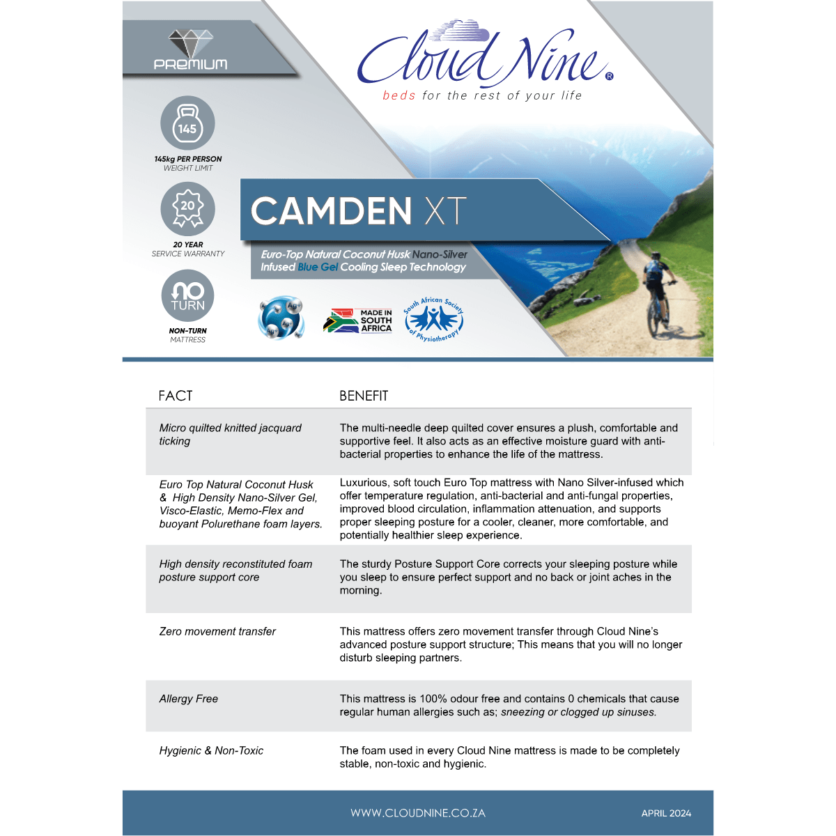 Specifications of Cloud Nine Camden Three Quarter