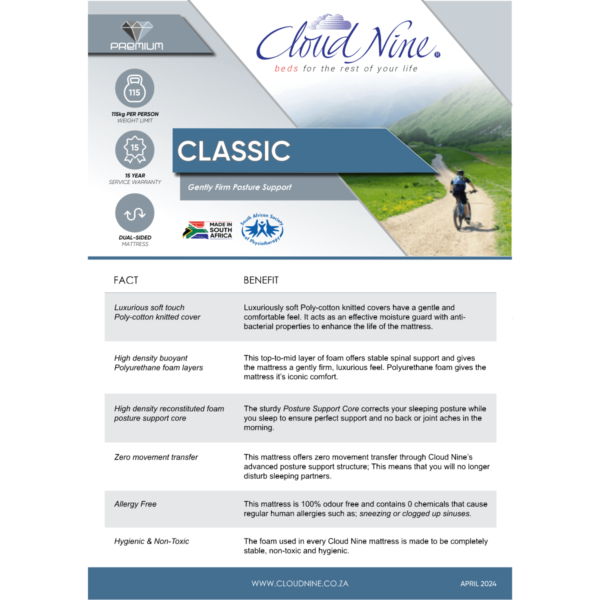 Experience Supreme comfort with the Cloud Nine Classic mattress, featuring a luxuriously soft poly-cotton cover. This gentle fabric provides a comfortable feel that makes you to sink into relaxation each night. Not only does it feel great, but it also acts as a highly effective moisture guard because of its antibacterial properties, which enhancing the mattress’s lifespan.