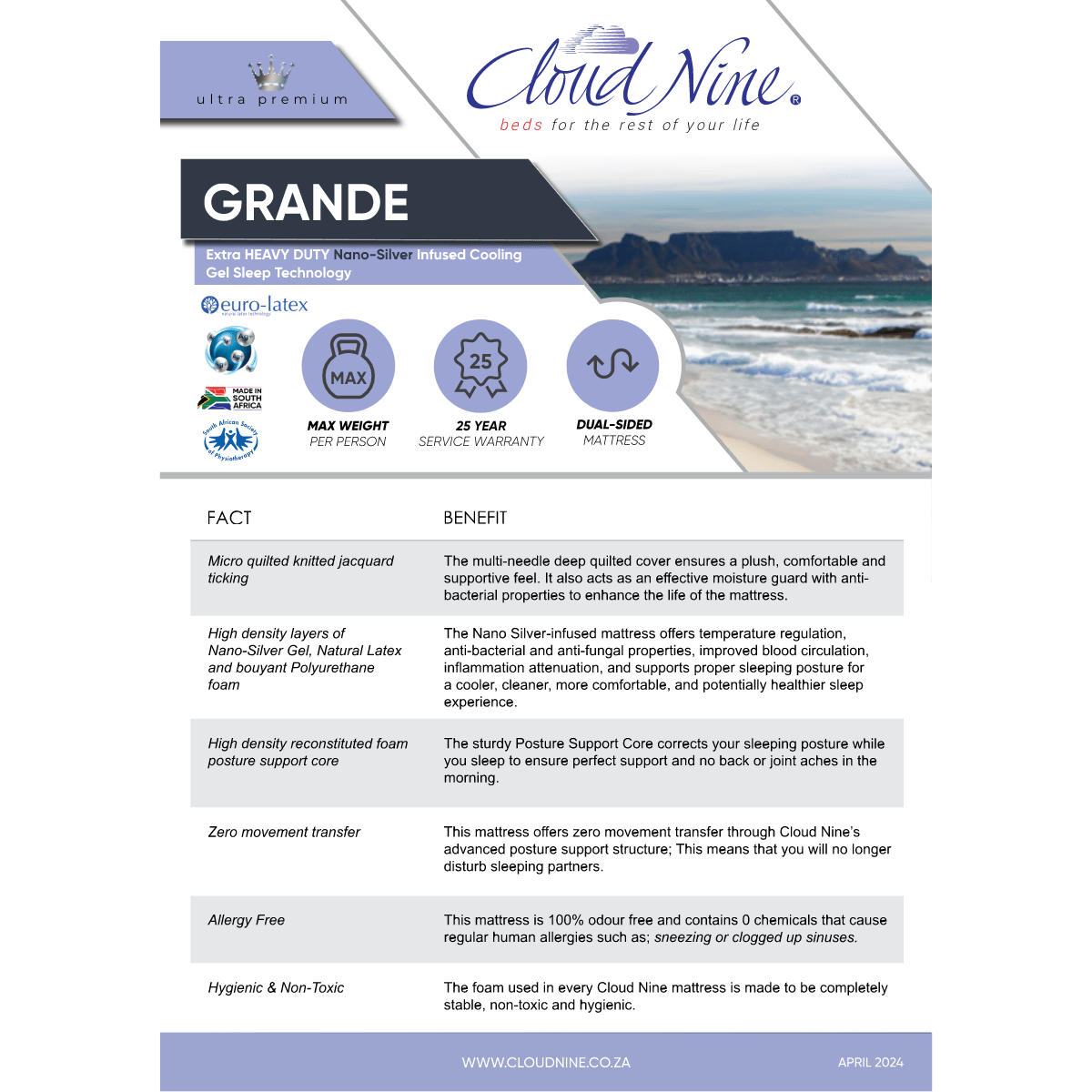 Indulge in luxury with its high-density layers of Nano-Silver Gel, natural latex, and buoyant polyurethane foam. The Nano Silver-infused Grande mattress offers temperature regulation, anti-bacterial, and anti-fungal properties, promoting improved blood circulation and inflammation for a cooler, cleaner, and potentially healthier sleep experience for you.