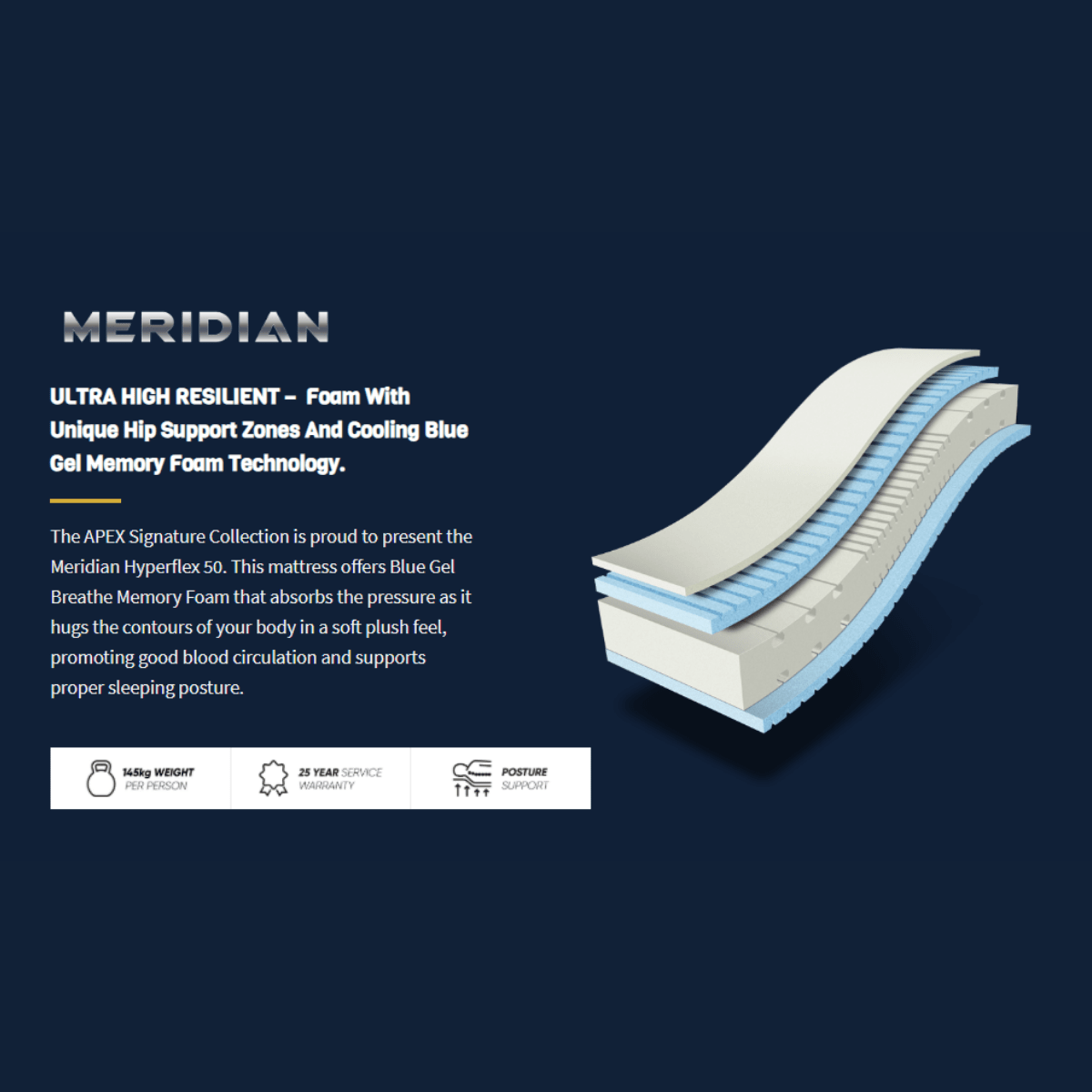 The Meridian is part of Cloud Nine’s APEX Signature Collection and offers the pinnacle of luxury sleeping paired with cooling blue gel memory foam technology.