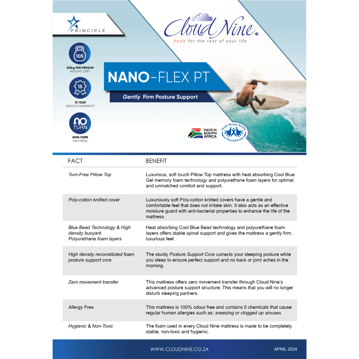 The Nano-Flex mattress offers zero movement transfer through Cloud Nine’s advanced posture support structure, ensuring that you won’t disturb your sleeping partner. Additionally, this mattress is 100% odour-free and contains no chemicals that causes common allergies such as sneezing or clogged sinuses. All foam used in the Nano-Flex mattress is made to be completely stable, non-toxic, and hygienic.