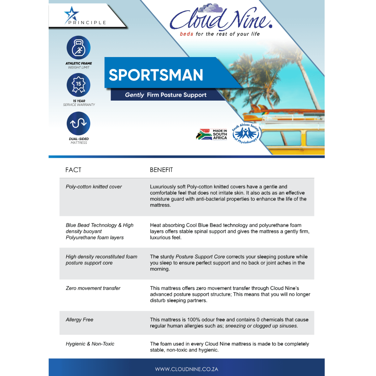Order the Cloud Nine Sportsman Medium from Beds Online today and enjoy fast delivery anywhere in South Africa—along with expert assistance and trusted after-sales support.