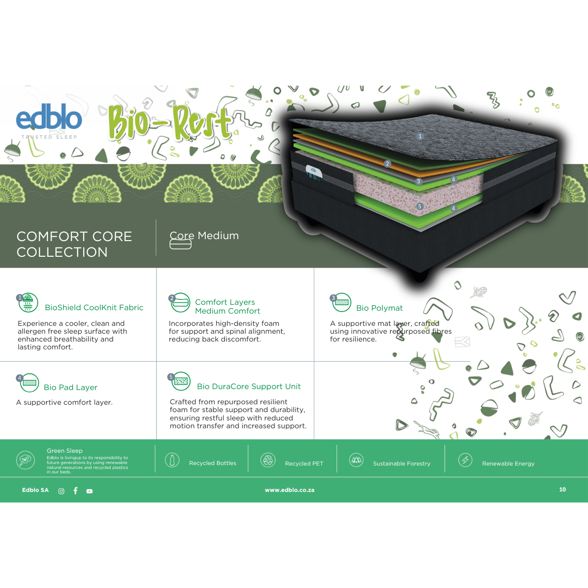 • Bio DuraCore Support Unit: Made from repurposed high-resilience foam for consistent support and reduced motion transfer throughout the night.
