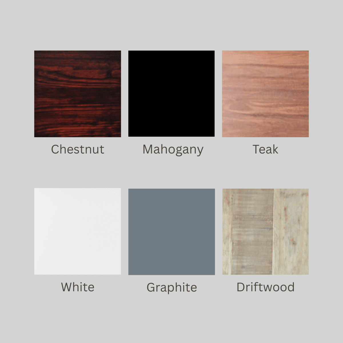 | Colour | Chestnut, Driftwood, Graphite, Mahogany, Teak, White |
