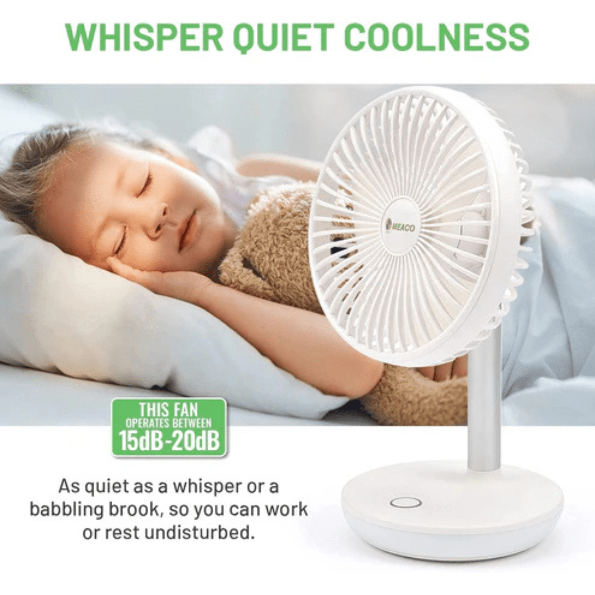 Powered by a reliable DC fan motor, the Meaco fan 260c combines whisper-quiet operation with impressive energy efficiency. Enjoy up to 14 hours of cooling on a single full charge.