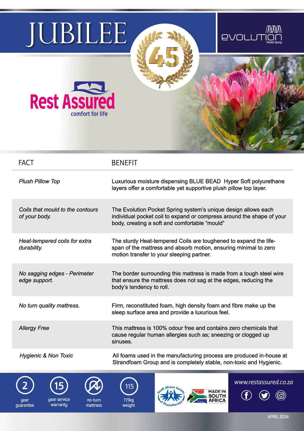 Experience luxurious comfort with the Jubilee 45 mattress, featuring a plush pillow top with moisture-dispensing BLUE BEAD Hyper Soft polyurethane layers. These layers provide a comfortable yet supportive surface. The Evolution Pocket Spring system’s unique design allows each individual pocket coil to expand or compress around the shape of your body, creating a soft and comfortable “mould” that enhances your sleep quality and overall experience.