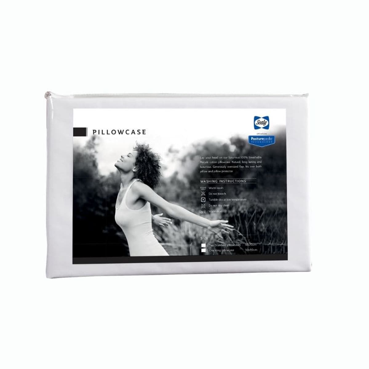 Lay your head on Sealy’s luxurious 100% breathable percale cotton pillowcase. Natural, long-lasting and luxurious. Generously oversized flap fits over both pillow and pillow protector.