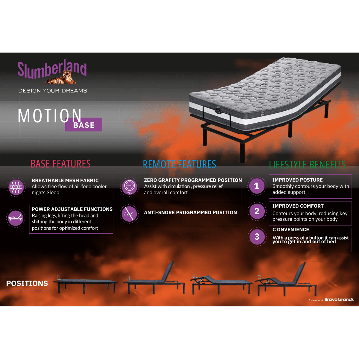 The Slumberland Motion Base adapts to your unique sleeping positions, improving posture and comfort with just a touch of a button. With this adjustable bed frame, you can easily raise your legs, lift your head, and adjust to various positions using the state-of-the-art remote. The base includes features like a zero-gravity position for better circulation, an anti-snore function, and a convenient night light. Together, these features elevate your sleep experience.