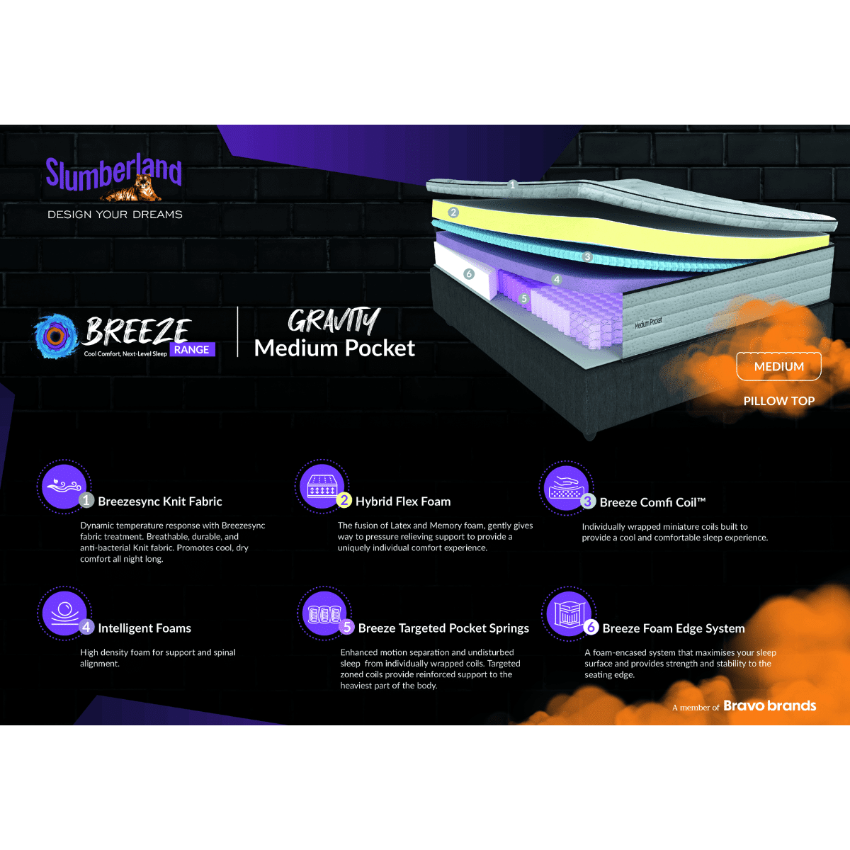 - Breeze Comfi Coil™ Layer: Miniature individually wrapped coils conform to your body for a cooler, more comfortable sleep experience.