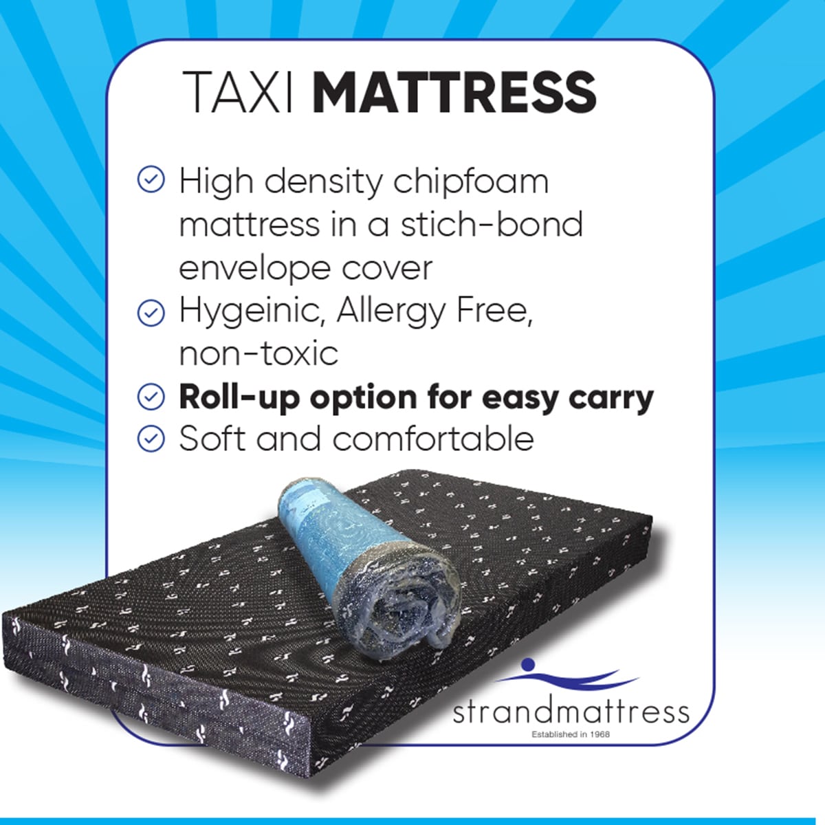 Enjoy soft, supportive sleep wherever you go with the Strandmattress Taxi Portable Mattress. Built with high-density chipfoam and wrapped in a durable stitch-bond cover, this 15cm all-foam mattress offers lasting comfort and support—perfect for camping trips, caravans, or as a portable guest bed.
